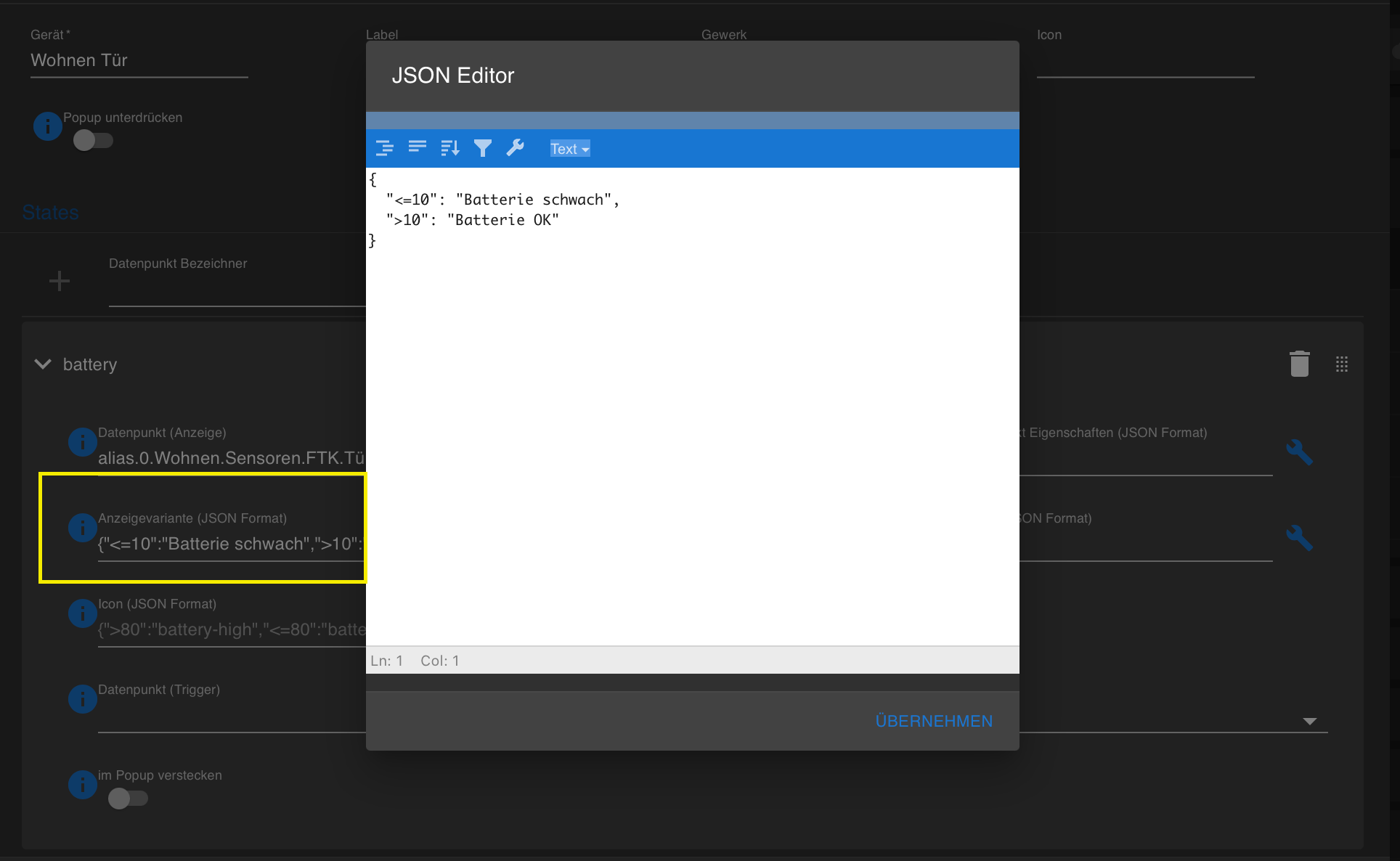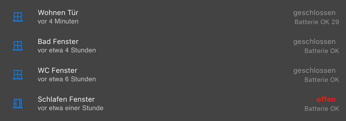 Ich habe aktuell einen FensterTürKontakt, der den Battery in % rausgibt, die anderen FTKs geben nur BatteryLow=True raus. Hab mir überlegt den einen FTK aus optischen Gründen dann halt mit <=10% als "Batterie schwach" und alles >10% als "Batterie OK" darzustellen. Das funktioniert in sofern, dass der Text zwar dort steht, aber die 29(%) vom Datenpunkt stellt Jarvis dennoch dar. Ich hatte gehofft, durch Eintrag der Schwellen in der Anzeigevariante wird der eigentliche Wert automatisch vollständig ausgeblendet. Hab ich das falsch verstanden? Und falls ja, bekomme ich die 29(%) vom Datenpunkt hinter dem Text dann auf eine andere Art ausgeblendet?